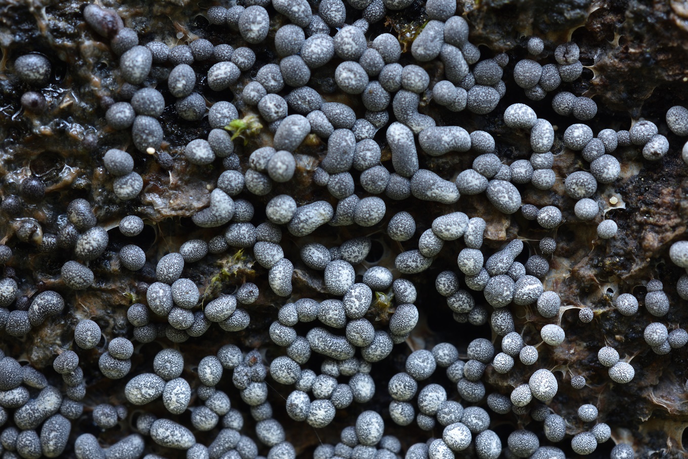 1-9 - Brefeldia maxima (?) (На стоячей мёртвой сосне. Заметил краем глаза утром, и они были светлые, но к вечеру окраска изменилась); 10 - Cerioporus squamosus (С того же места, что и в отчёте за 26 апреля); 11 - Coprinellus micaceus.