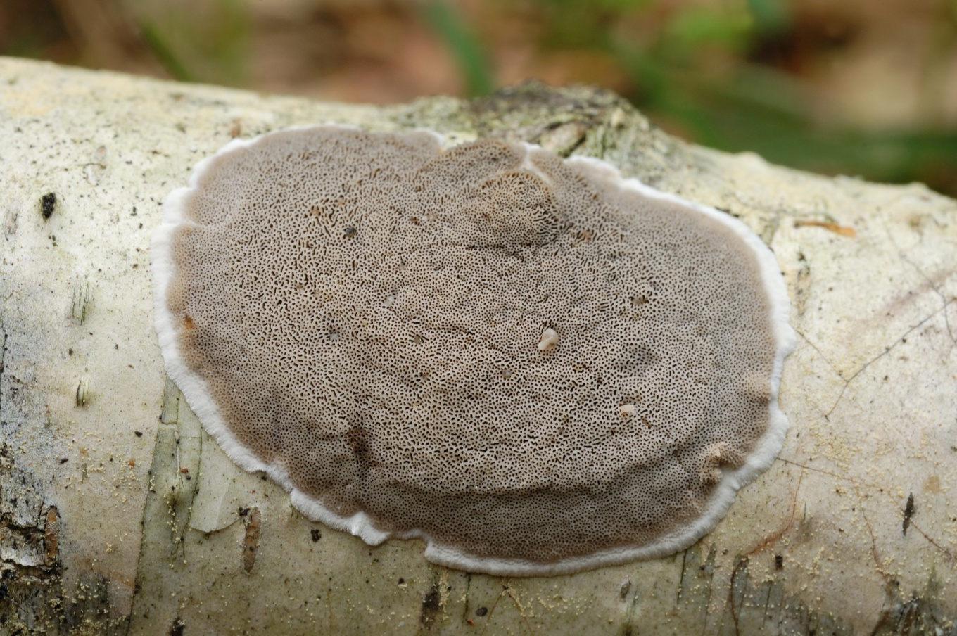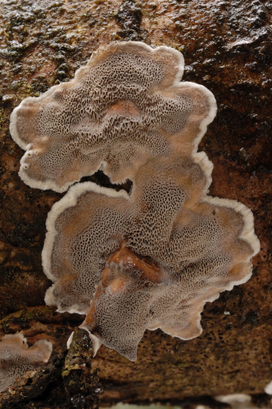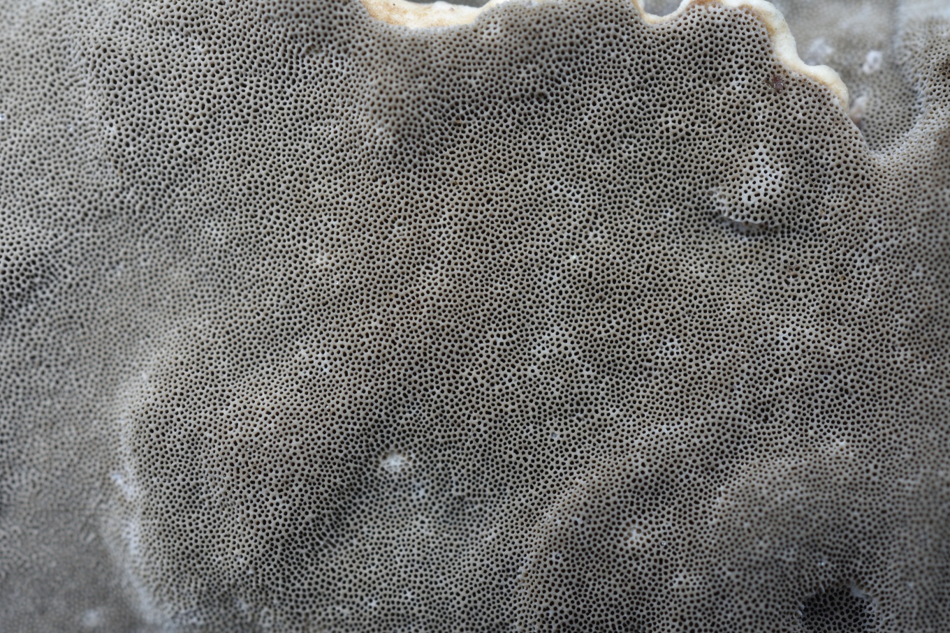 - Плодовое тело относительно тонкое, поры относительно тёмные, на разрезе тёмный сам слой трубочек, а не линия над ним.