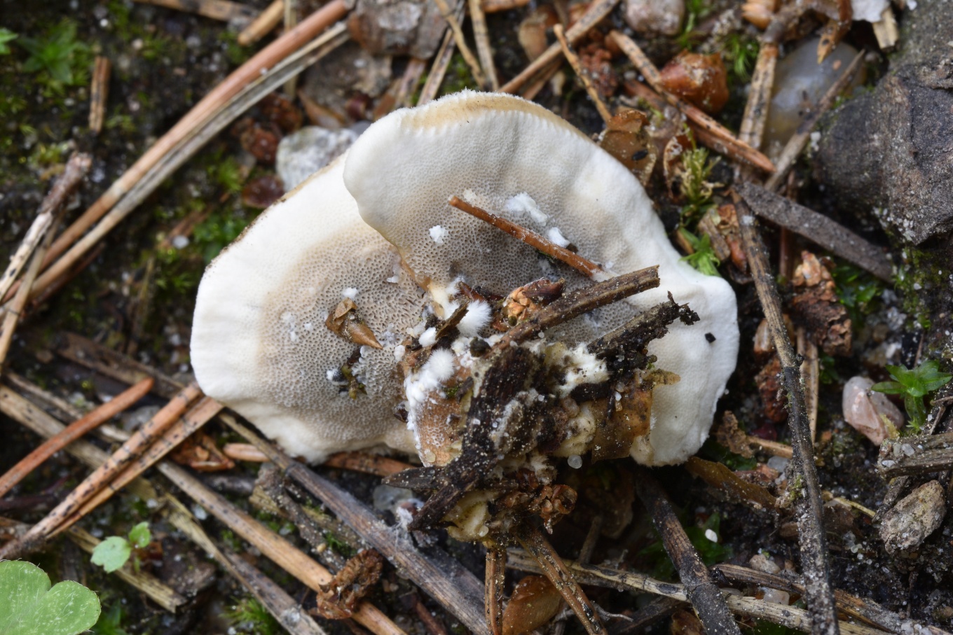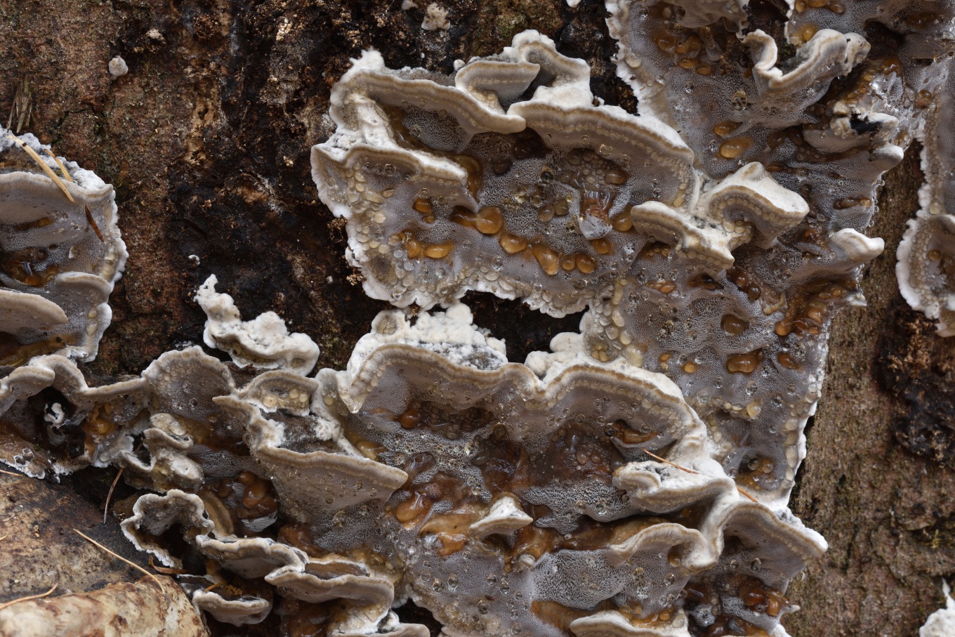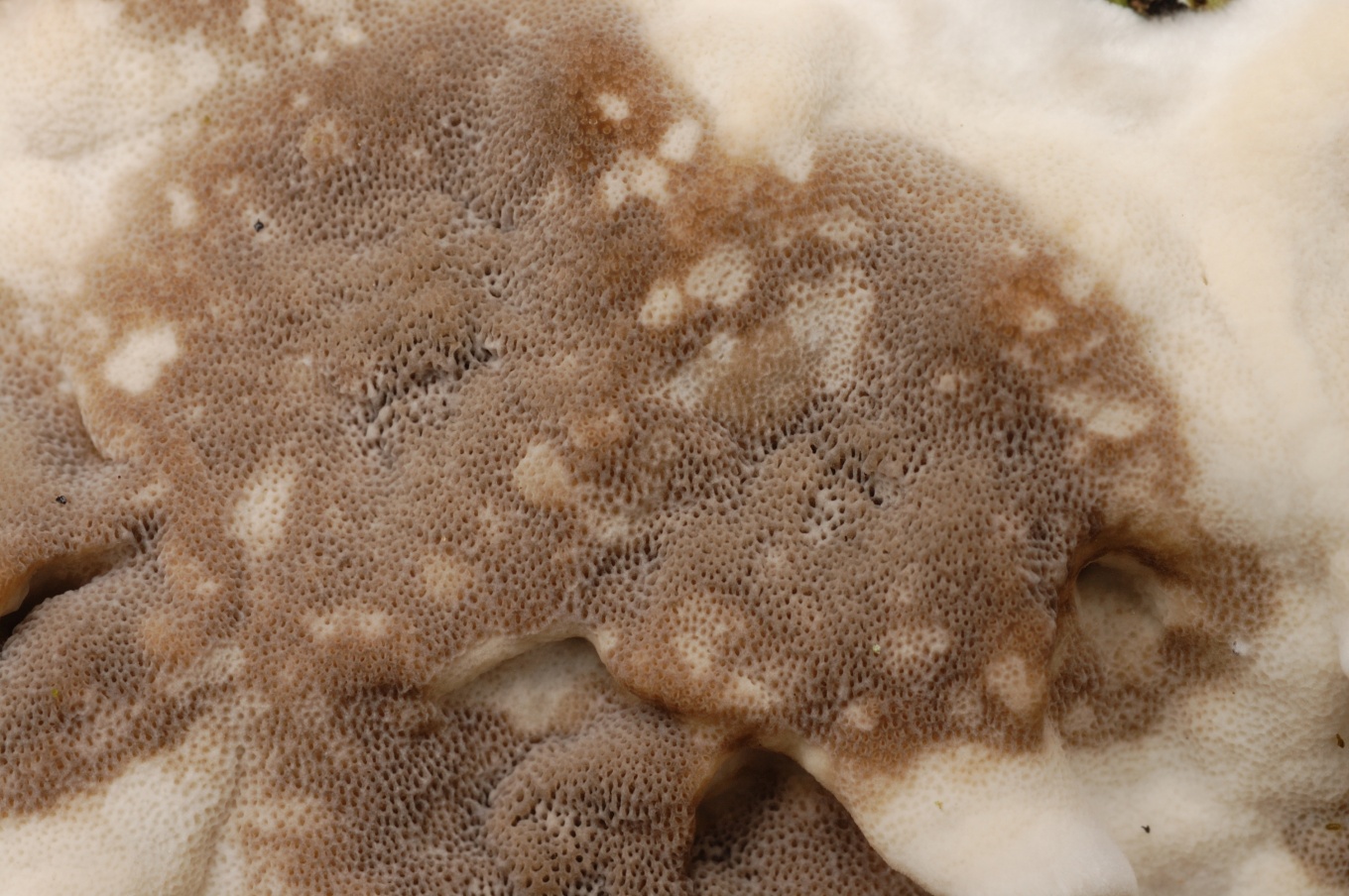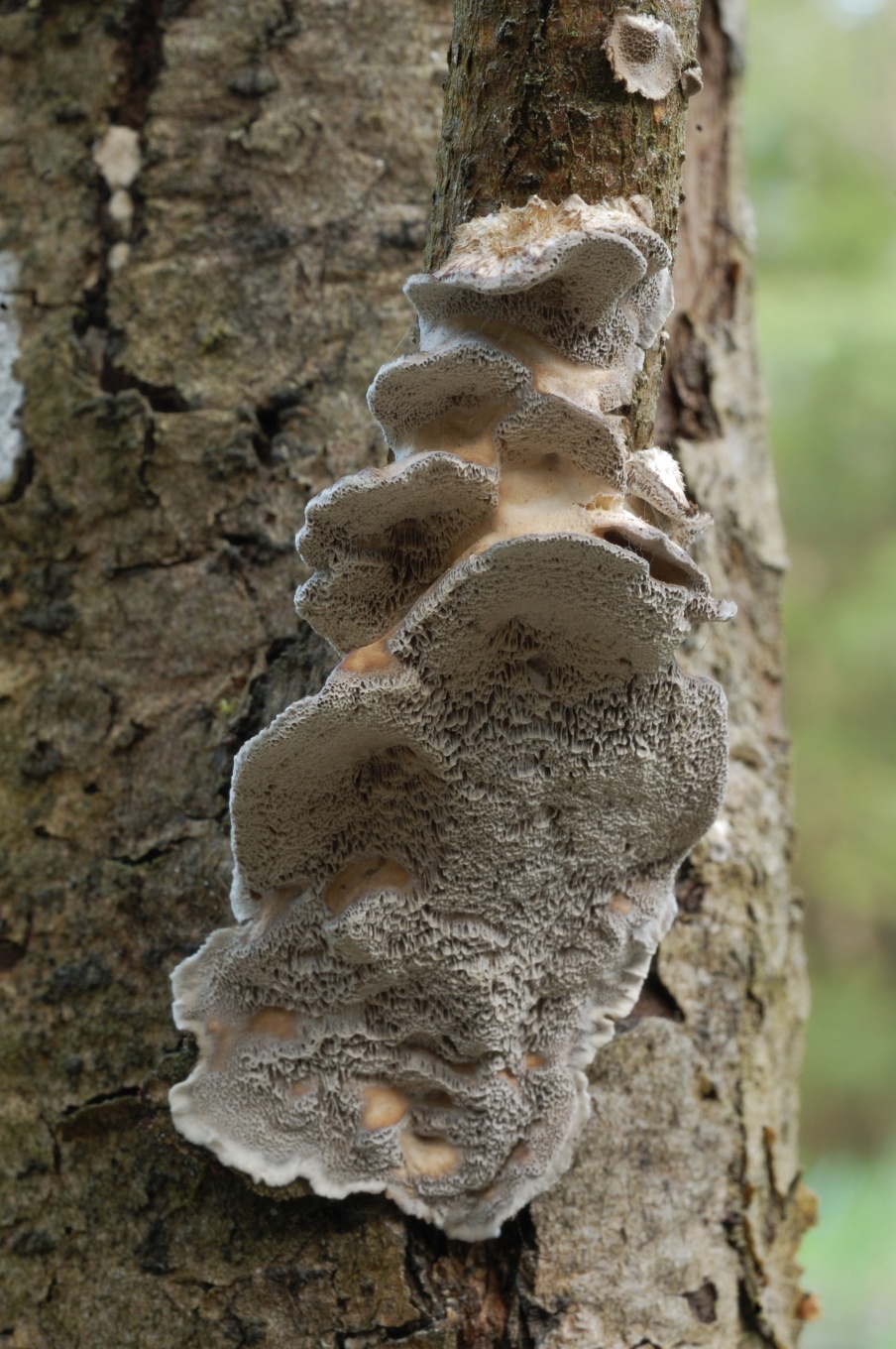 - Плодовое тело относительно тонкое, поры относительно тёмные, на разрезе тёмный сам слой трубочек, а не линия над ним.
