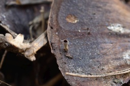 Плодовое тело: Различных оттенков коричневого (с желтоватыми или сероватыми тонами). Диаметром до 3 - 15 мм. Ножка 2 - 7 (11) × 0.7 - 1.5 мм.