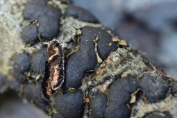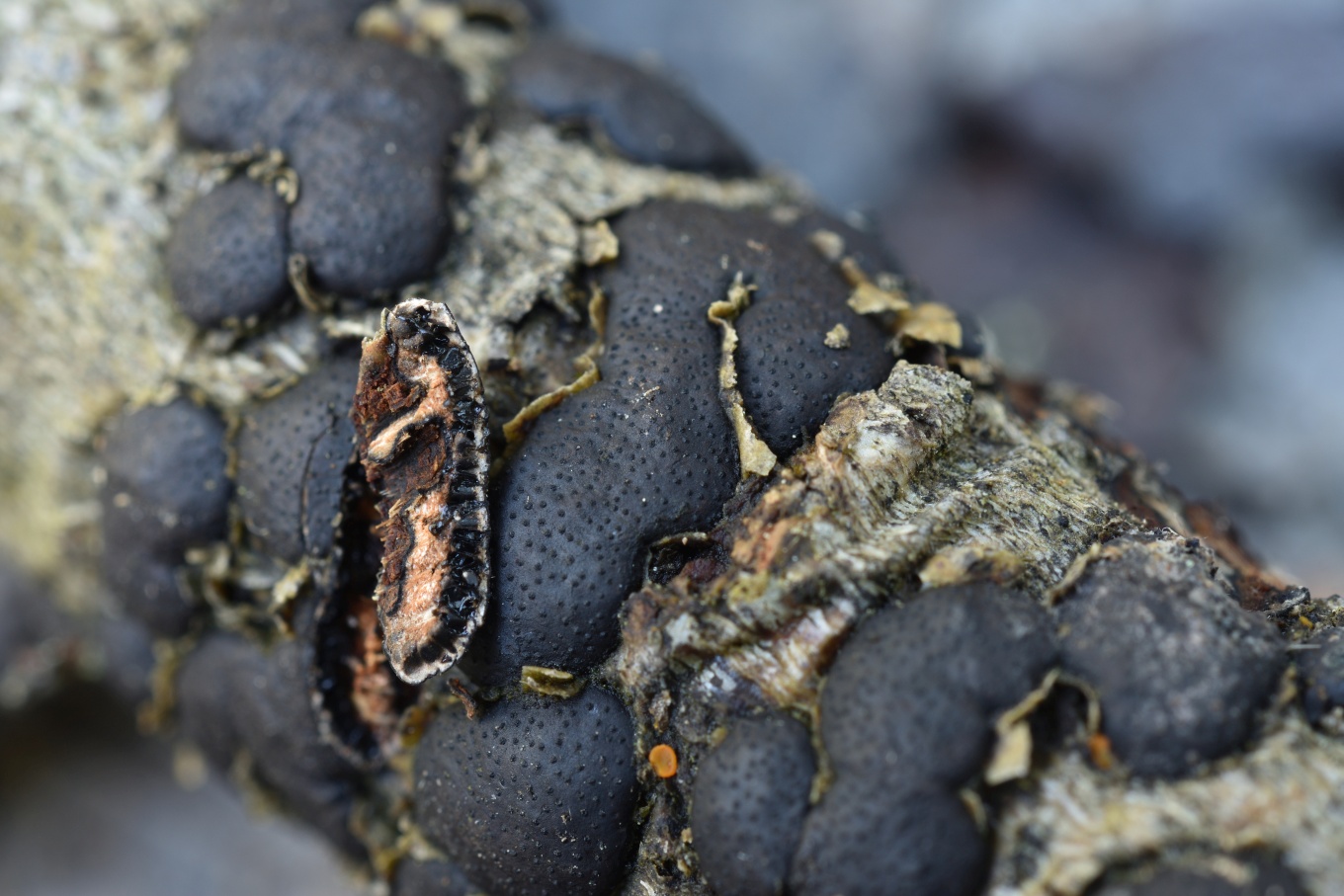 Строма: Подушковидная, обычно более или менее круглая, слегка бугорчатая, чёрного цвета. Развивается под корой, которую в зрелости разрывает.