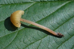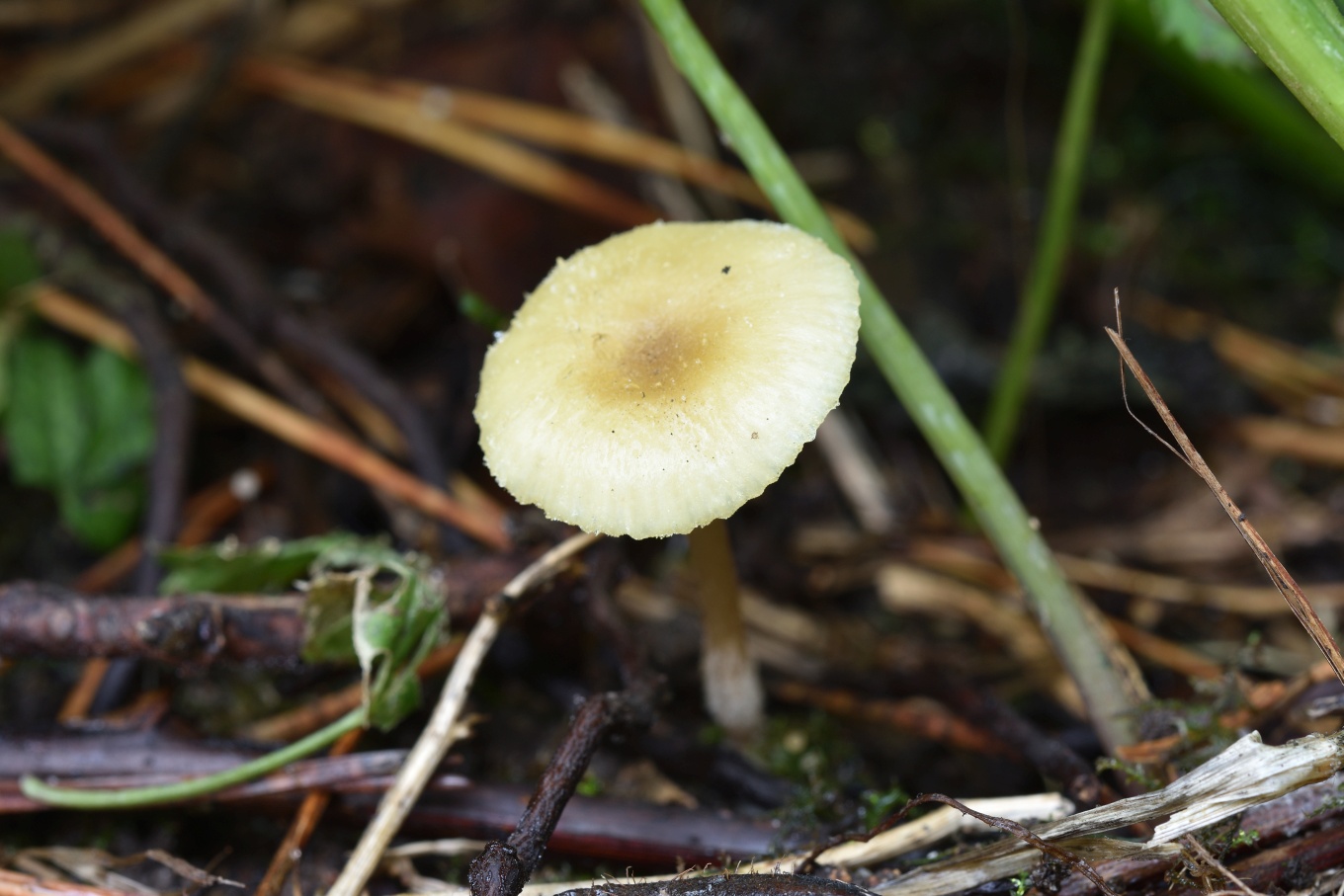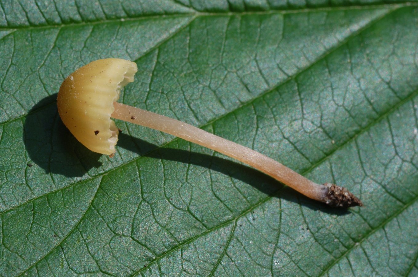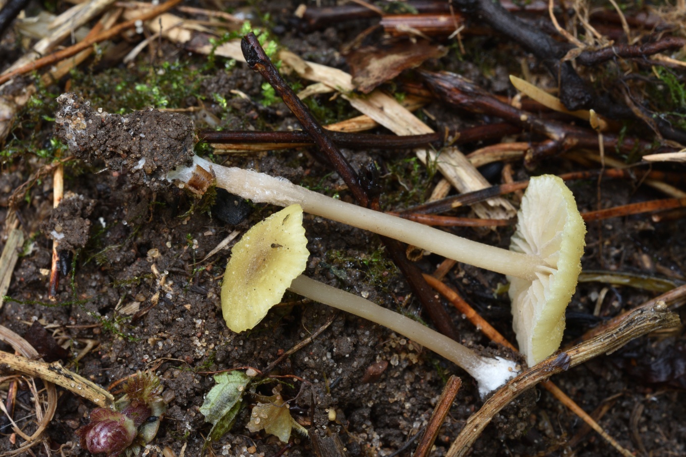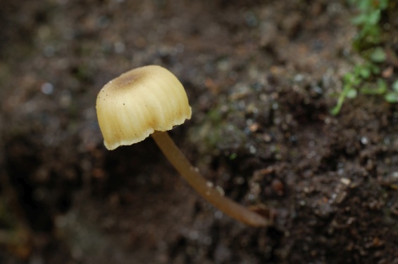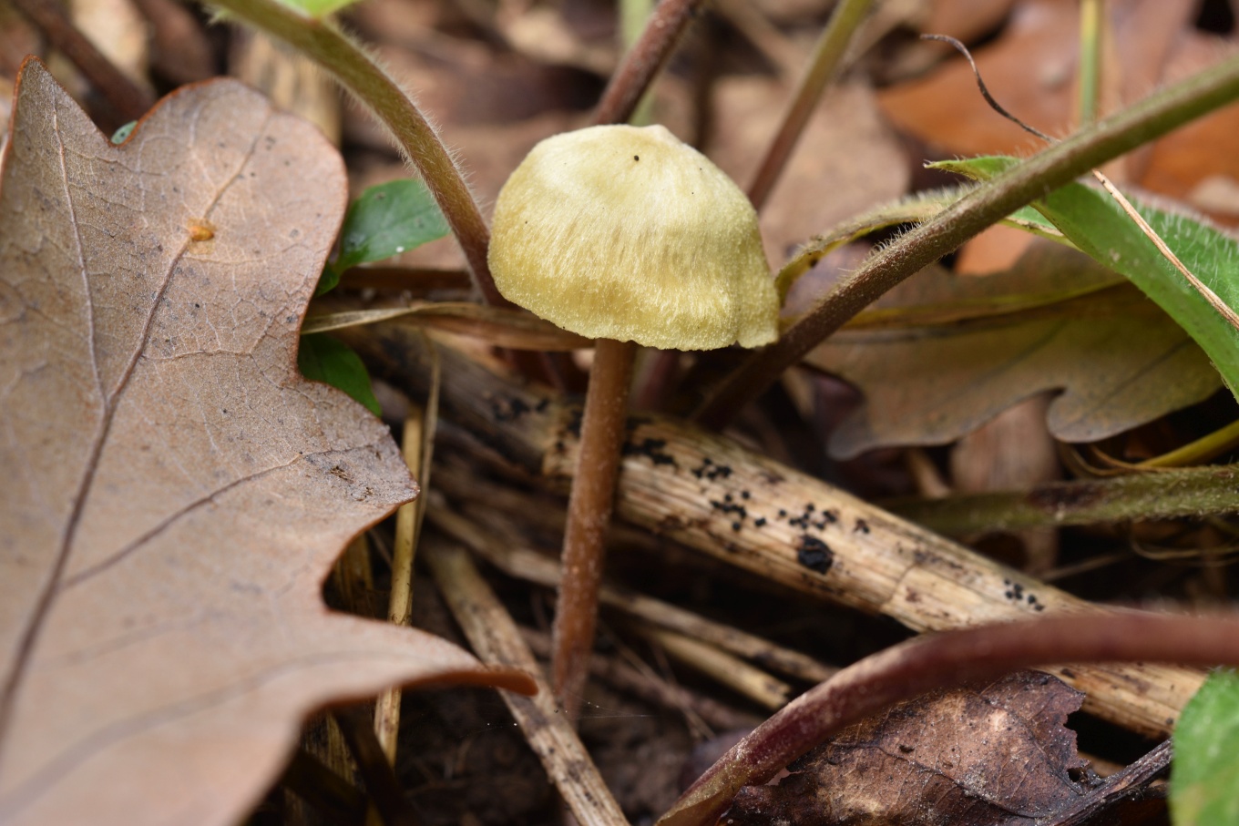 Шляпка: Диаметром до 1-3 см, колокольчатая или выпуклая, нередко с уплощением в центре. Довольно характерной окраски: желтоватая, с лимонным или охристым оттенком, в центре скорее коричневатая. Край часто неровный, полосатый. Гигрофанная.