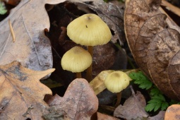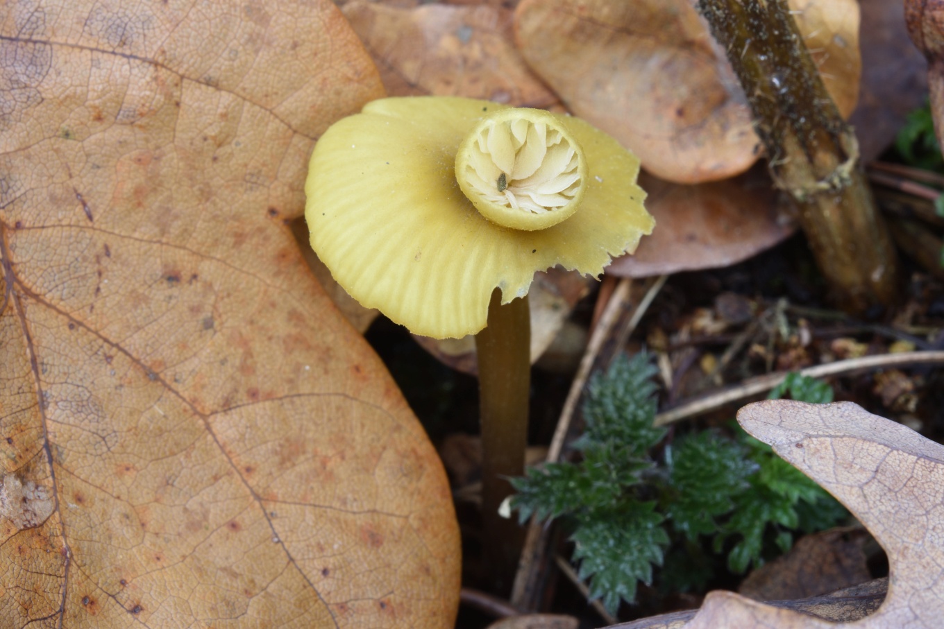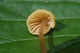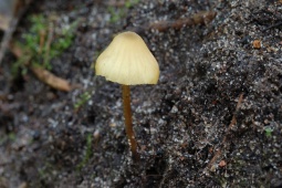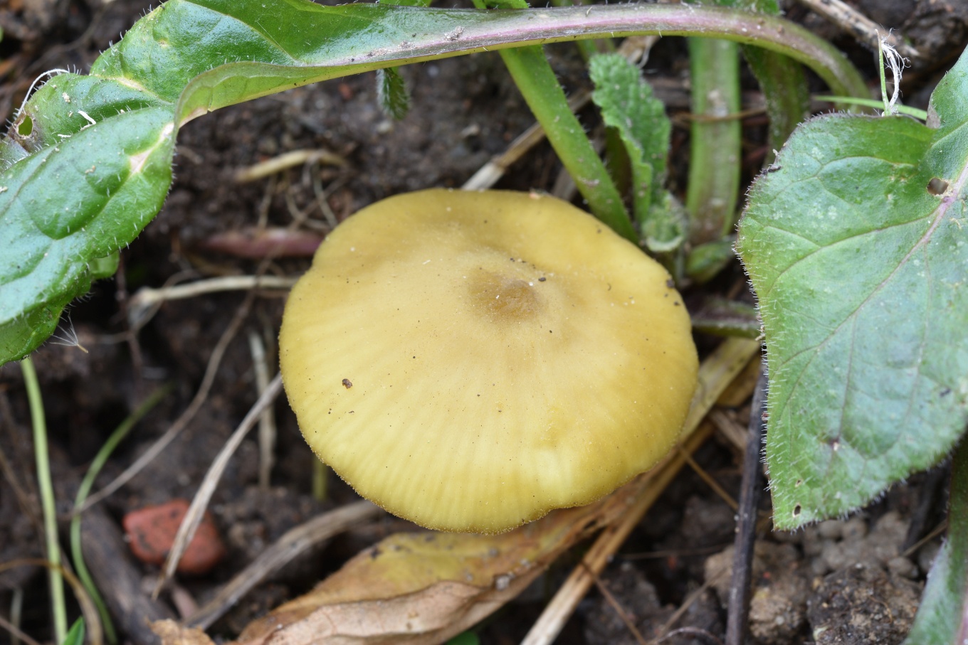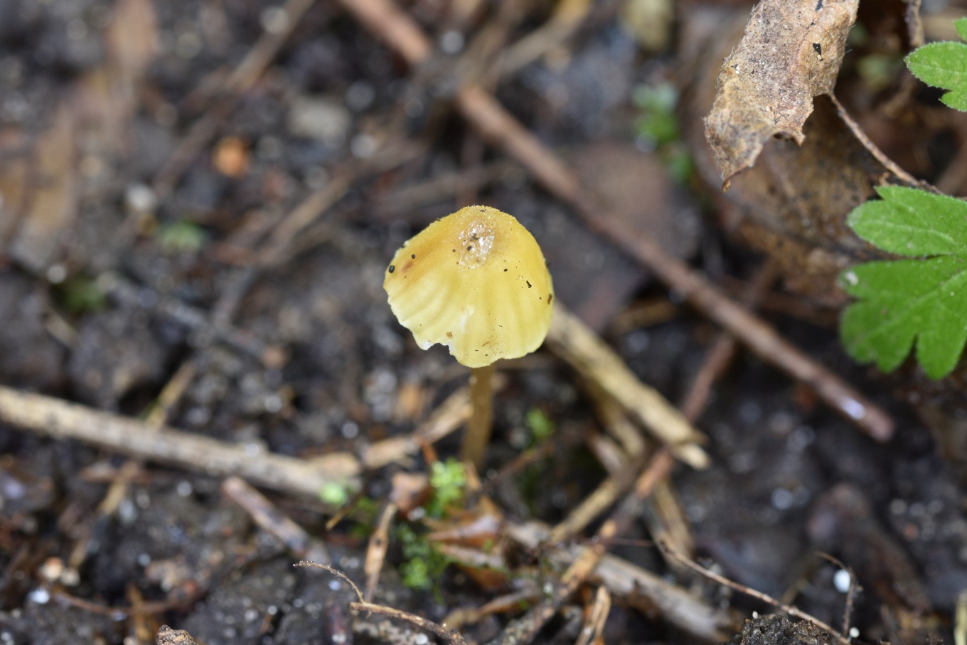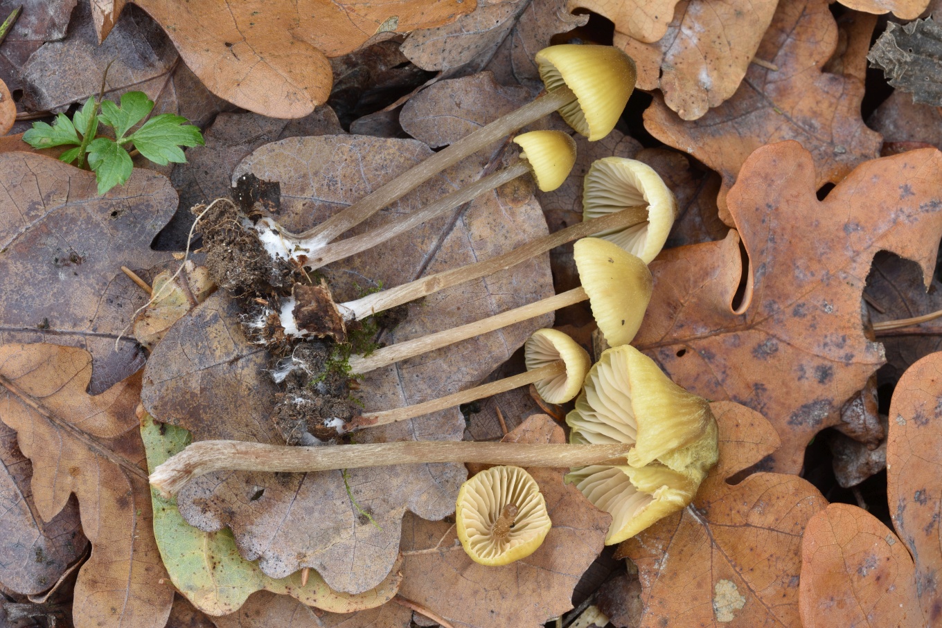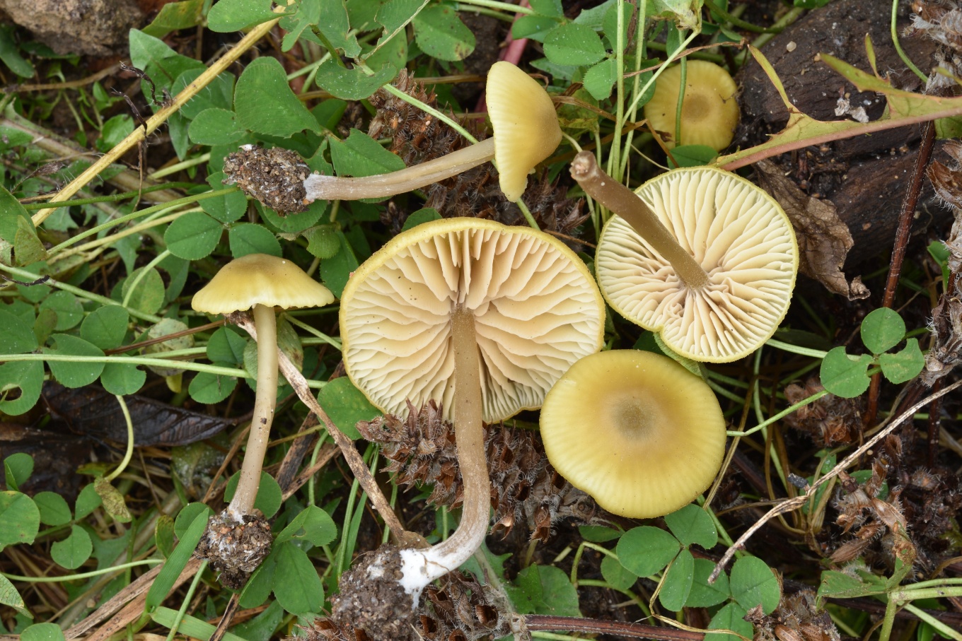 Шляпка: Диаметром до 1-3 см, колокольчатая или выпуклая, нередко с уплощением в центре. Довольно характерной окраски: желтоватая, с лимонным или охристым оттенком, в центре скорее коричневатая. Край часто неровный, полосатый. Гигрофанная.