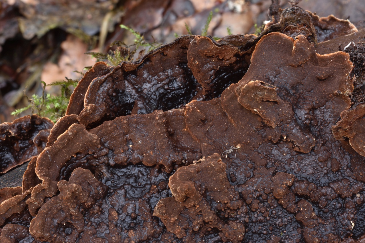 Гименофор: Гладкий, красновато-коричневый, часто с несколькими гимениальными слоями; под лупой можно увидеть мельчайшие коричневые щетинки.