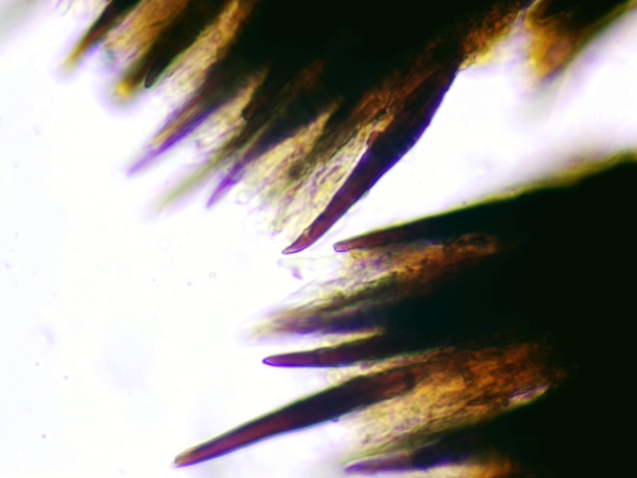 - Гимениальные щетинки шиловидной формы, 30 - 75 × 4 - 11 мкм; также могут присутствовать редкие щетинки в траме, 60 - 80 × 4 мкм.