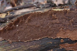 Плодовое тело: Приросшее боком, с хорошо развитой шляпковидной частью; жёсткое; с трудом отделяется от субстрата. Коричневое или черноватое; под воздействием KOH чернеет.