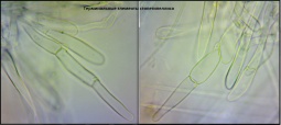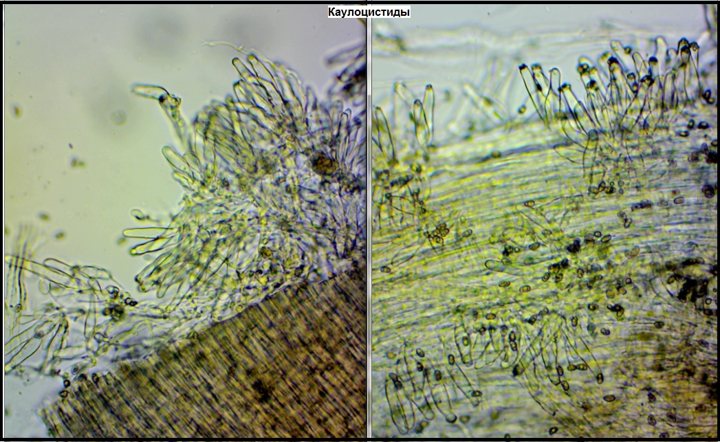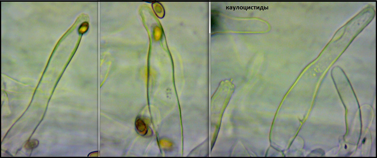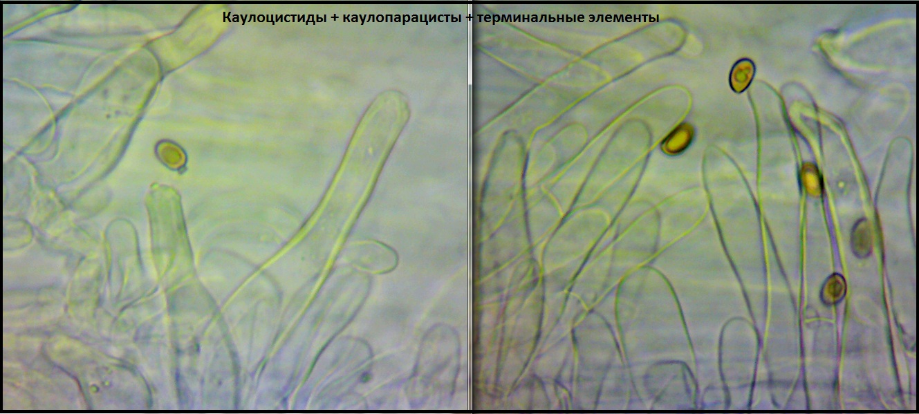 - Каулоцистиды только вверху ножки 45-95 × 8-15 мкм, часто очень длинные и узкие (почти)веретеновидные до почти-цилиндрических с волнистыми краями стенки, с коротким основанием, на вершине обычно с мелкими кристаллами, стенки толщиной до 1,0 (-1,5) мкм вверху, желтовато-зеленоватые с 3% КОН; вперемешку с многочисленными бесцветными удлиненными (почти)булавовидными тонкостенными каулопарацистидами.