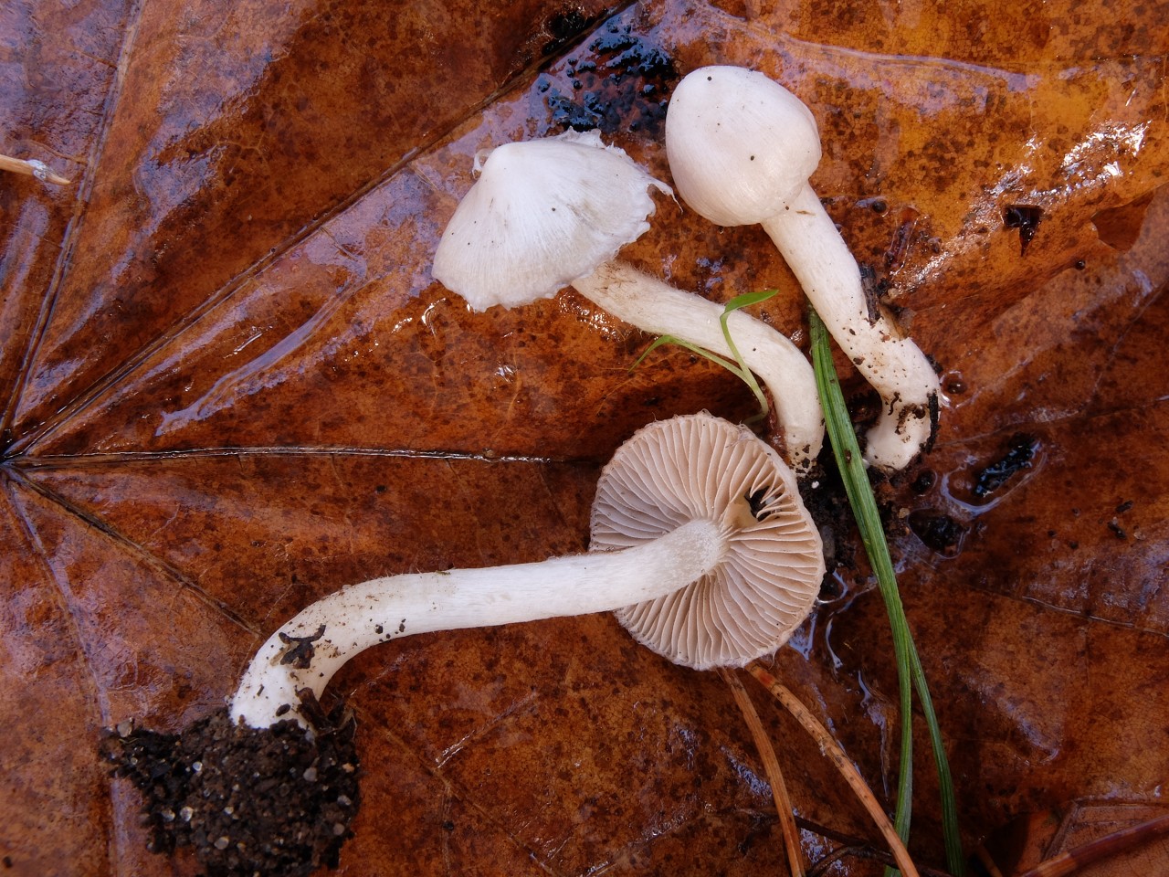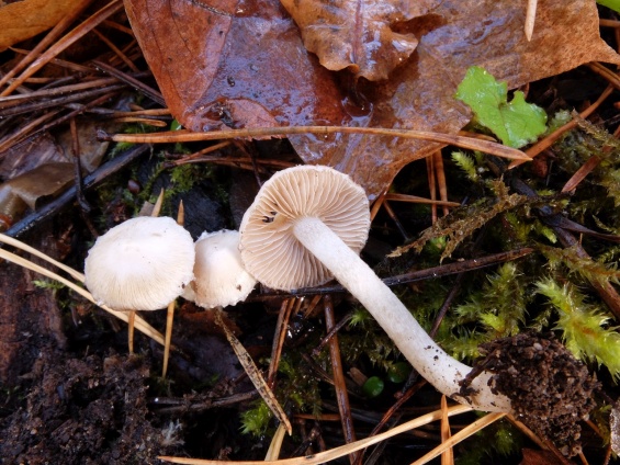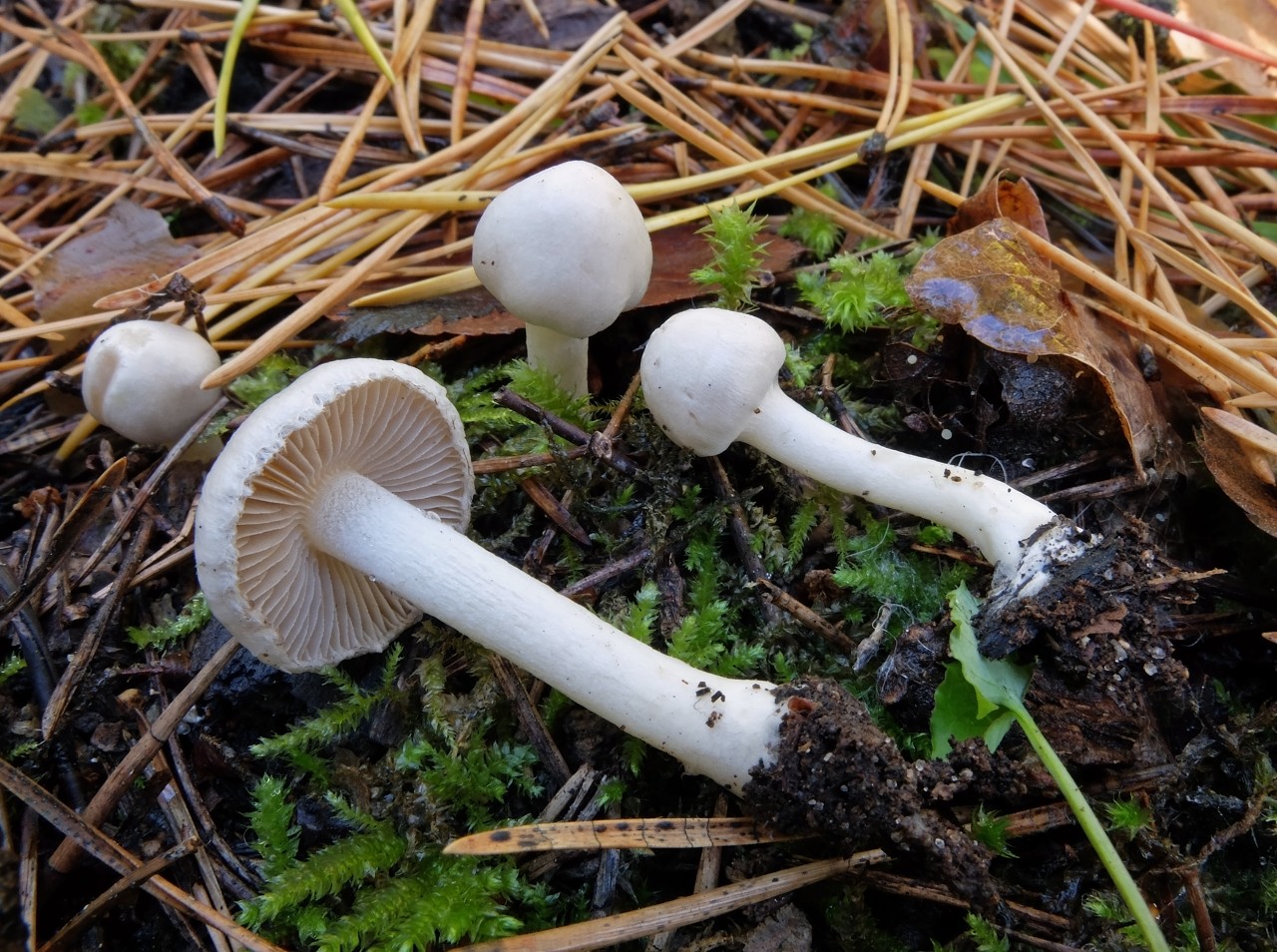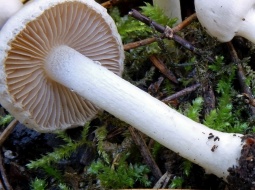 Ножка: 20-50 × 1-3 мм, цилиндрическая или изогнутая, основание иногда утолщенное, сначала полностью беловато-волокнистое, позже с продольными прожилками или гладкое, сначала беловатое, позже грязно-беловатое до бледно-соломенного цвета, вверху с мучнистым налётом.