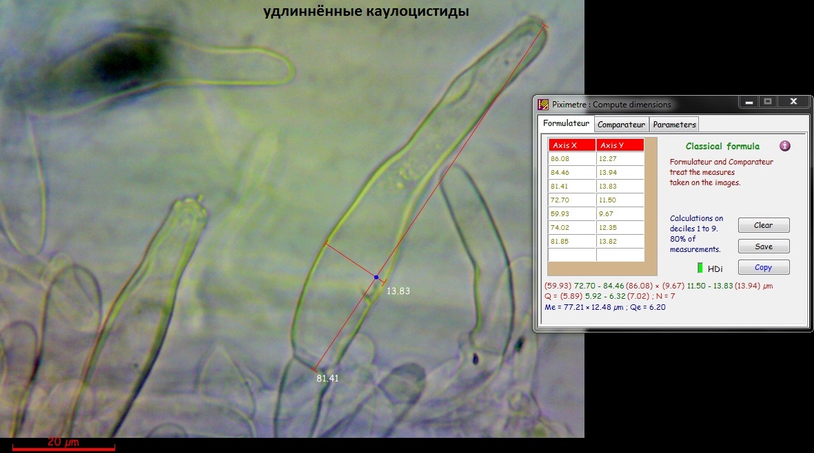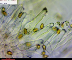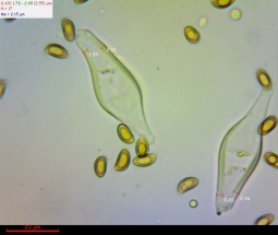 - Хейлоцистиды сходны по размеру, но несколько более изменчивы по форме; смешаны с многочисленными бесцветными (почти)булавовидными тонкостенными парацистидами.