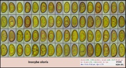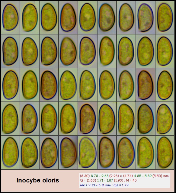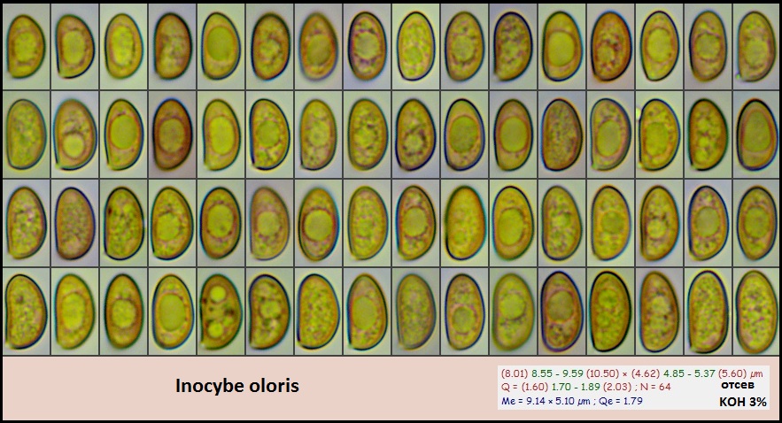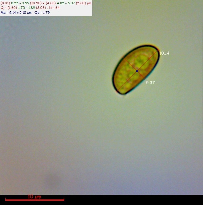 - Споры 7,9-9,4-10,5 × 4,5-5,1-5,9 мкм; Q = 1,6-1,8-2,1 (n = 80 из 2 колл.), гладкие, удлиненные (почти)миндалевидные, (почти)фасолевидные или почти-цилиндрические, часто с более или менее выраженной надхилярной депрессией, с тупым апикальным концом.