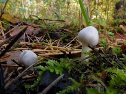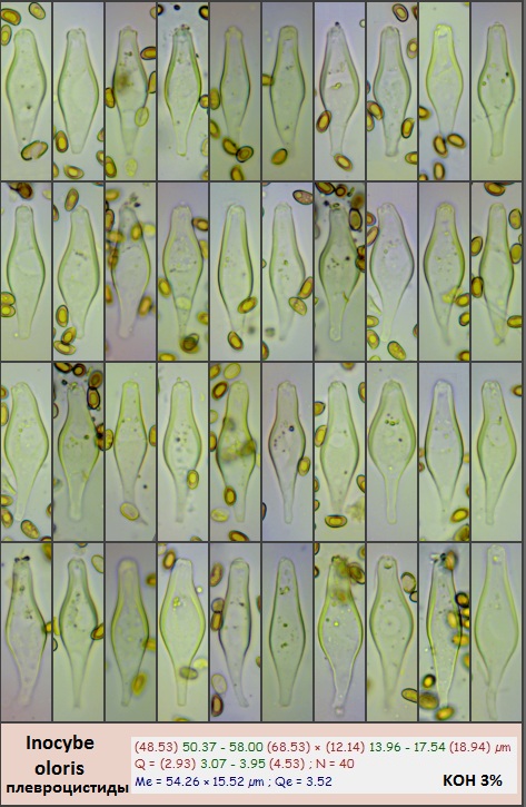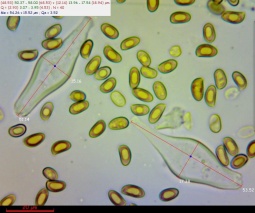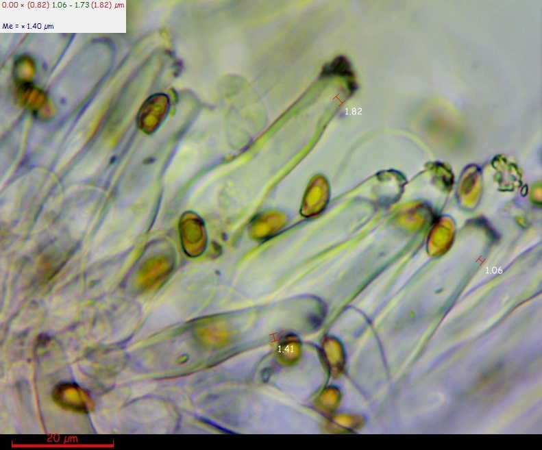 Комментарии: Споры, собранные в разные годы с одного места в Минской области, показывают полную идентичность со спорами типовых экземпляров, как по форме, так и по размерам. Средняя Q, уверенно находится в диапазоне 1,79 – 1,81 (измерено 259 спор у двух экземпляров, отсев). Данный показатель можно считать самым важным среди ключевых признаков при идентификации вида вокруг комплекса “geophylla”. Помимо удлинённых каулоцистид с волнистыми краями вперемешку с удлинённо-булавовидными каулопарацистами, нами обнаружено большое количество удлиннённых и септированных терминальных элементов стипитипеллиса. В тех же самых зонах и в больших количествах. Смотреть изображения микропризнаков.