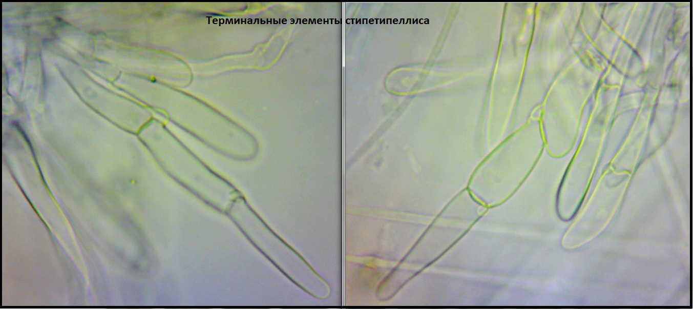- Пилейпеллис состоит из эпикутиса, состоящего из желтоватых гиф шириной 4-8 (-10) мкм, не покрытых париетальным пигментом, и подкожного слоя с более широкими и светлыми или бесцветными гифами.