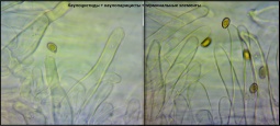 - Базидии 23-28 × 7-10 мкм, обычно 4-споровые, иногда 2-споровые (споры до 12,3 мкм).