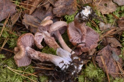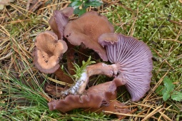 Пластинки: Широко приросшие, в молодости с явным сиреневым оттенком, позже выцветают до розовых.