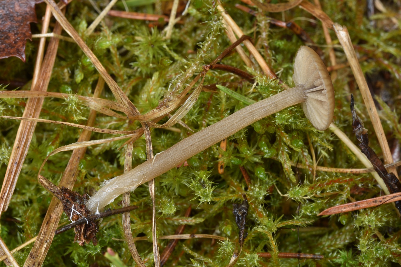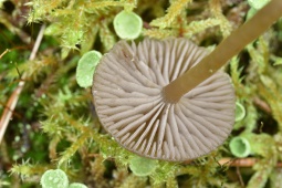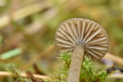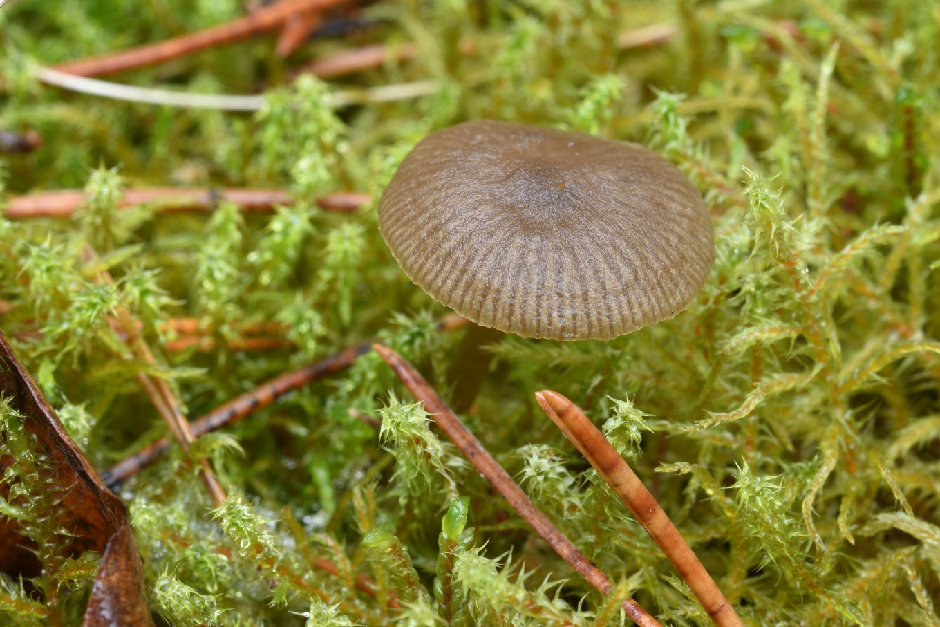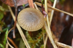 - Шляпка диаметром до 1 - 2.5 см. Плоско-выпуклая или с небольшим углублением в центре. Гигрофанная. Во влажную погоду серовато-коричневая, чуть с оливковым оттенком, край полосатый до середины радиуса, при высыхании становится бледно-бежевой.