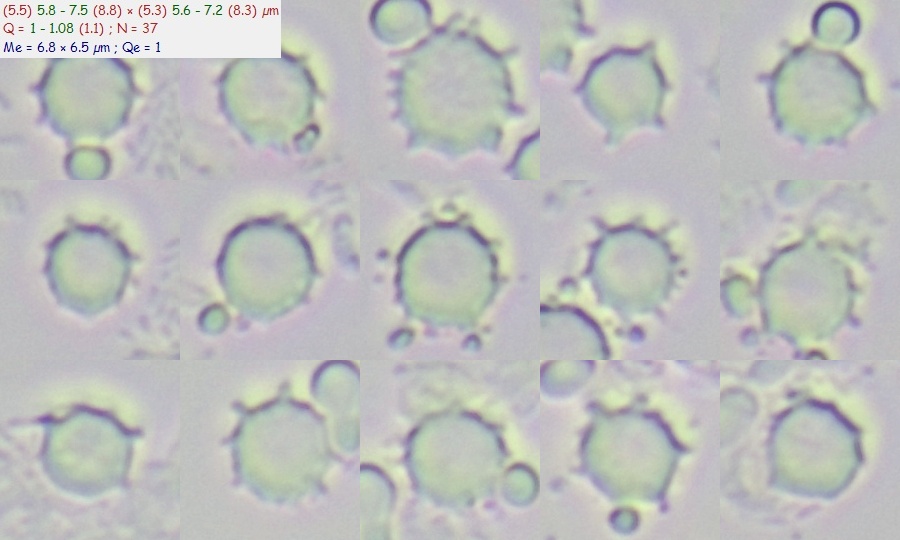 - Споры 5.5 - 7.5 × 5 - 6.5 мкм, почти шаровидные, неамилоидные, с длинными (до 1.5 мкм) шипами, которые придают им звездообразную внешность.