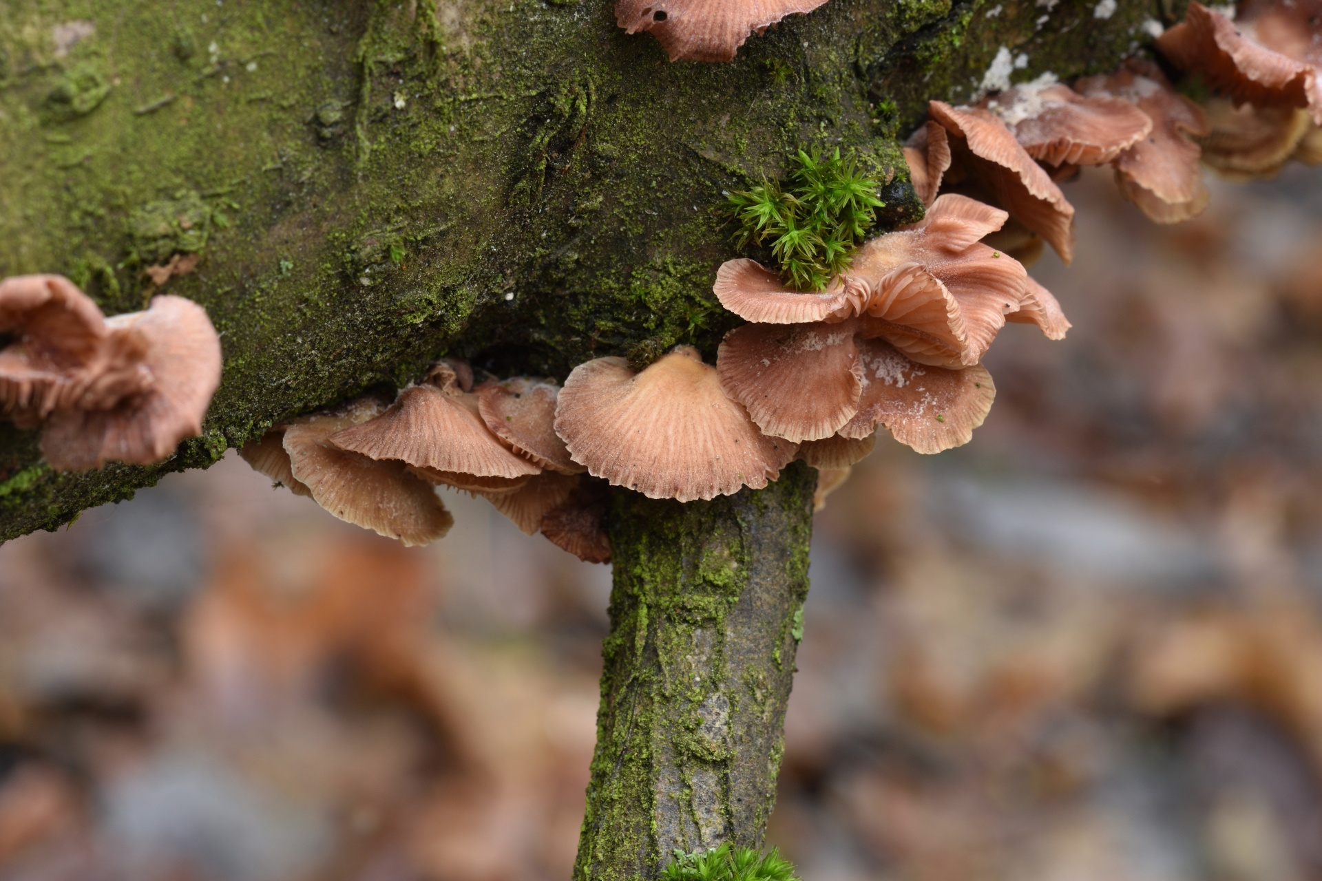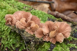Шляпка: Диаметром до 0.5 - 3 см. Имеет форму ракушки, крепится к субстрату верхней стороной. В окраске преобладают винные, серо-розовые, коричневатые тона.