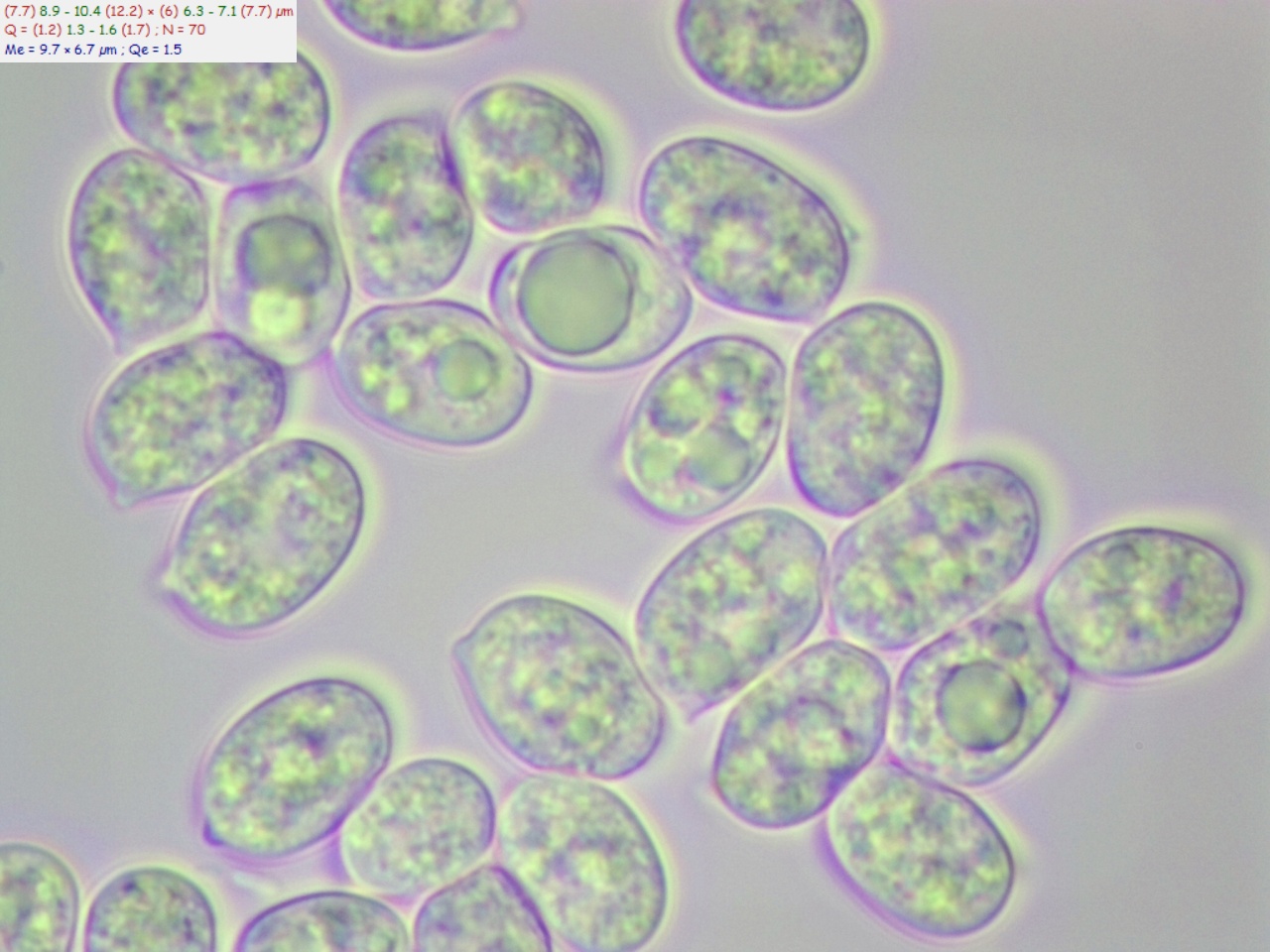 - Споры 8 - 12 × 6 - 8 мкм, широко эллипсоидальные, слегка толстостенные, неамилоидные, внутри с каплями масла.
