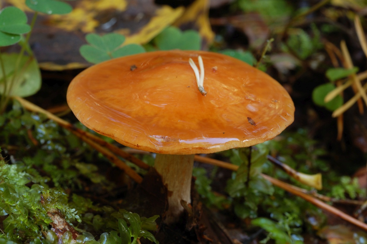 Шляпка: Диаметром до 5-10 см. Плоско-выпуклая или более или менее распростёртая, с лёгким бугорком. Слизистая. Ярко-оранжевая, с охристыми или коричневатыми тонами. Край слегка полосатый.