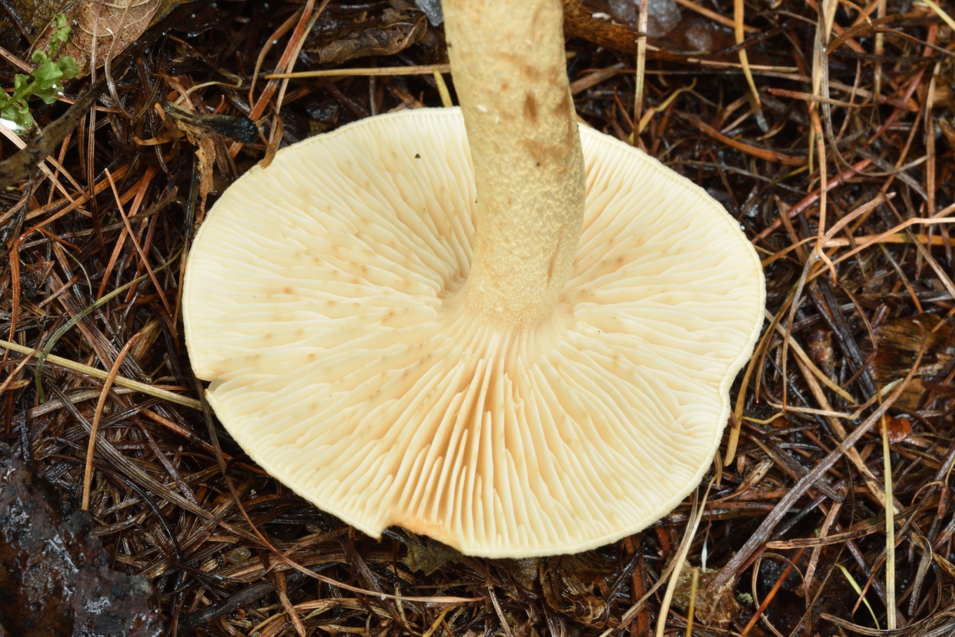 Пластинки: Приросшие зубцом, довольно редкие, бежево-кремовые или охристые.